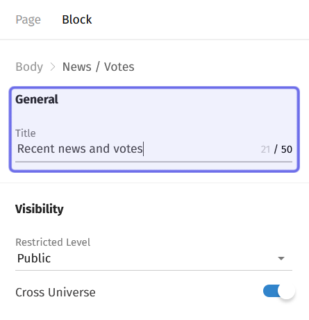 The side panel of a “News/Votes” block is shown above. The “General” section is highlighted in purple. This section looks the same in the side panel of “News” and “Votes” blocks.