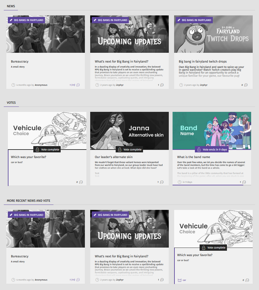 The news articles and/or votes displayed depend on which page the block is added to. The Landing Page draws from the relevant content of all Studios. On a Studio page, the block will draw from all of that Studio’s Universes. A block on a Universe page will only draw from content for that Universe.