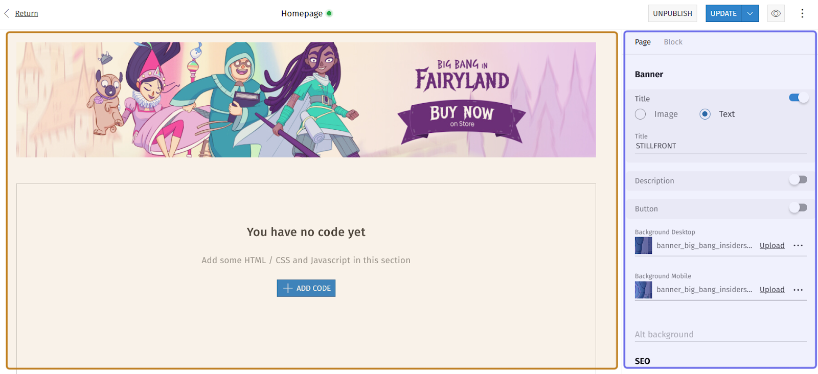 The “Update” button takes the place of the “Publish” button in the top-right corner of the CMS page. Following the same process as scheduling publication, you can also schedule an update.