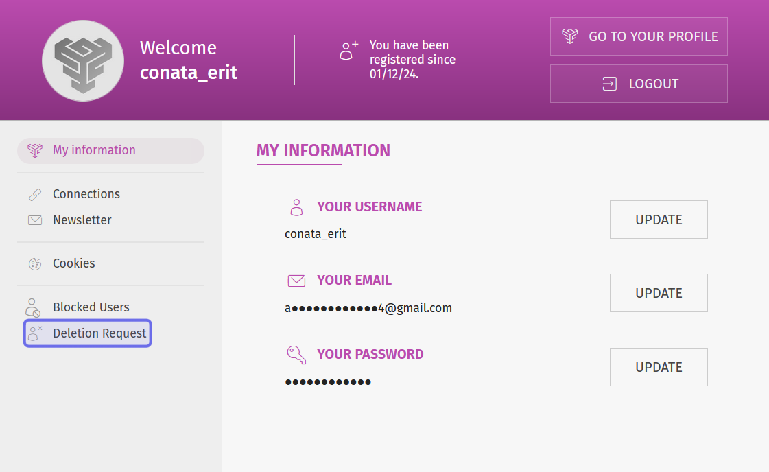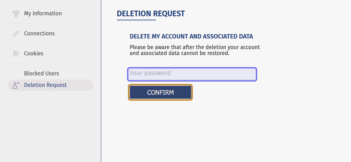 Click “Deletion Request” to begin the process of deleting your account data and the anonymization of your content.