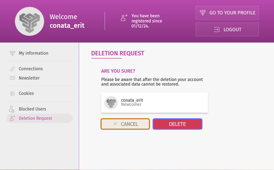 Click “Delete” to finalize the deletion. Your account data will be deleted and any content you had previously posted to the platform will be anonymized.