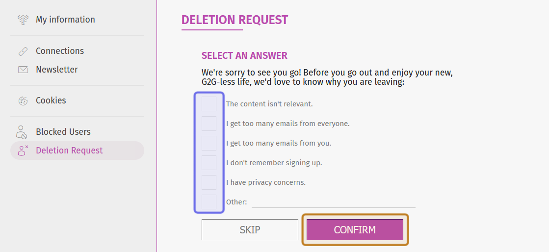 Click the tickbox that best matches the reason you are deleting your account. Then, click the “Confirm” button.