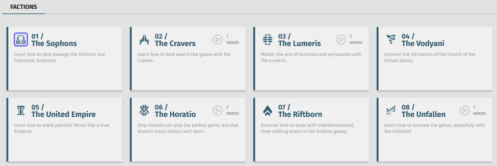 The “Factions” menu’s chapters are shown above. A chapter icon is highlighted in purple.