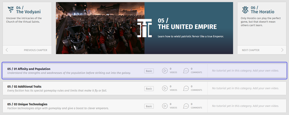 Chapters are used to organize tutorials by high-level game concepts. This helps the community know where they should share their own tutorials and more easily locate others’ by creating groupings such as Gameplay, Environment, Modding, etc.