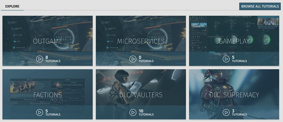 Six menus on a Universe’s “Tutorials” page are shown above.