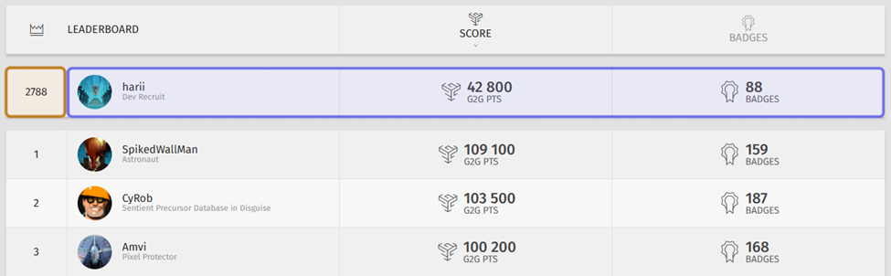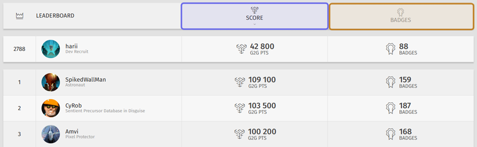 Your details are located above the leaderboard. Your ranking is to the left of your username and avatar. On the right are two columns. The left column displays your score, which is the total number of G2G points you have earned. The right column displays the total number of badges that you have unlocked.