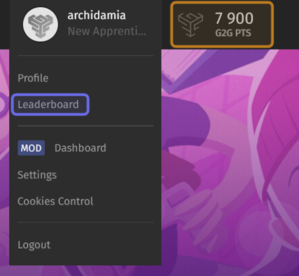 The right-hand side of the navigation menu is pictured above. The user’s G2G points total is highlighted in yellow. The user menu is expanded and “Leaderboard” is highlighted in purple.
