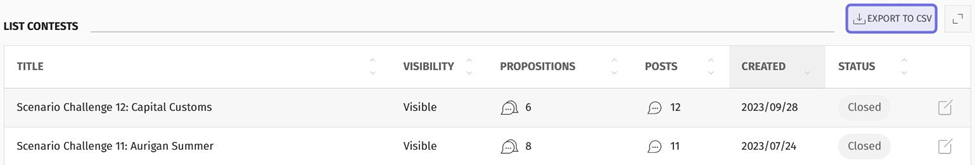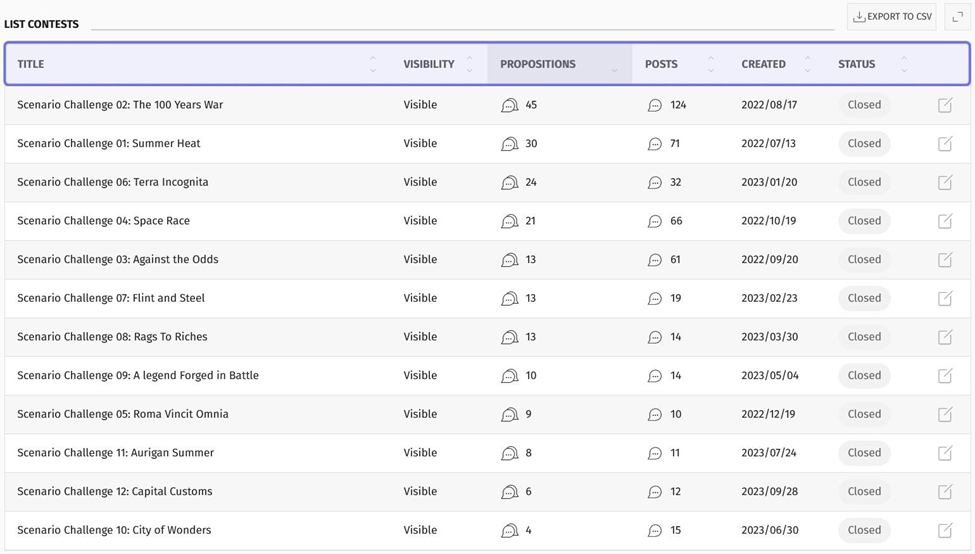 Click “Propositions” to sort contests by the lowest number of propositions submitted to the highest number submitted. Click again to reverse the sort.