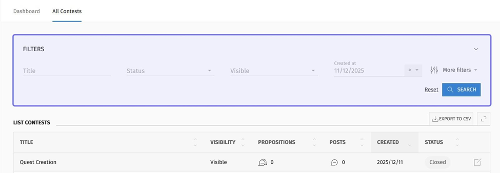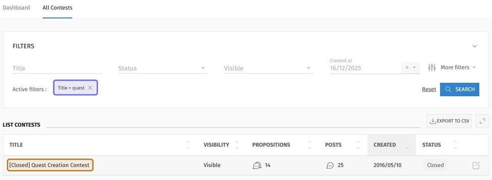 The “Filters” box also allows you to narrow down the list of contests by various pieces of information, such as a contest’s status and the number of propositions that users have submitted to a contest.
