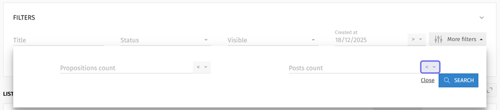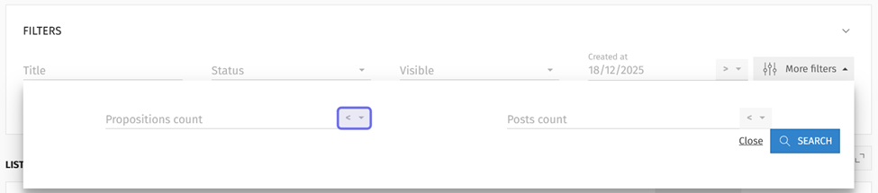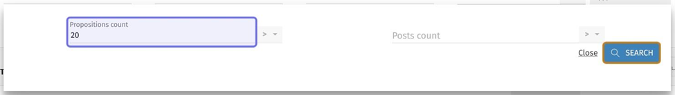 The “More filters” fields are pictured above. The arrow to select an operator for the “Propositions count” field is highlighted in purple.