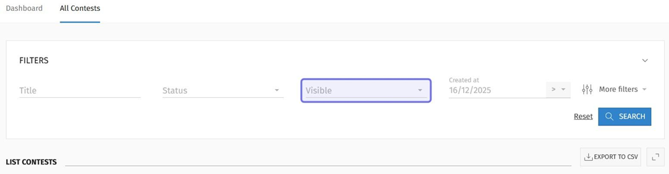 The “Visible” dropdown is to the right of the “Status” dropdown. Click the “Visible” dropdown to filter the list of contests by whether or not the contest is visible to users on the front end.