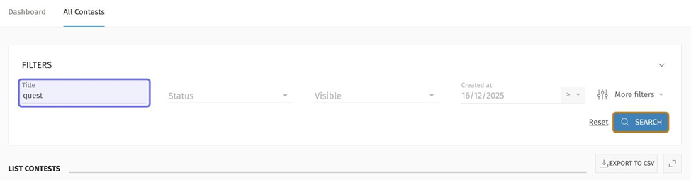 The list of contents beneath the “Filters” box will be updated to only include contests with a title that matches the keyword or phrase.