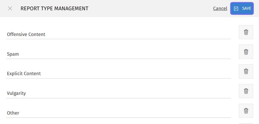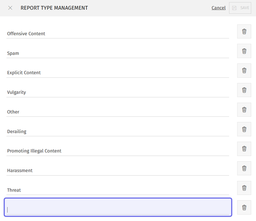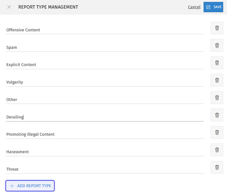Report types are used by non-moderator members on the front end. Report types allow members to flag content for moderators and provide insight into what type of content is commonly reported.