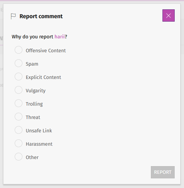 When a member reports content, they will be prompted to select a report type from the saved list.