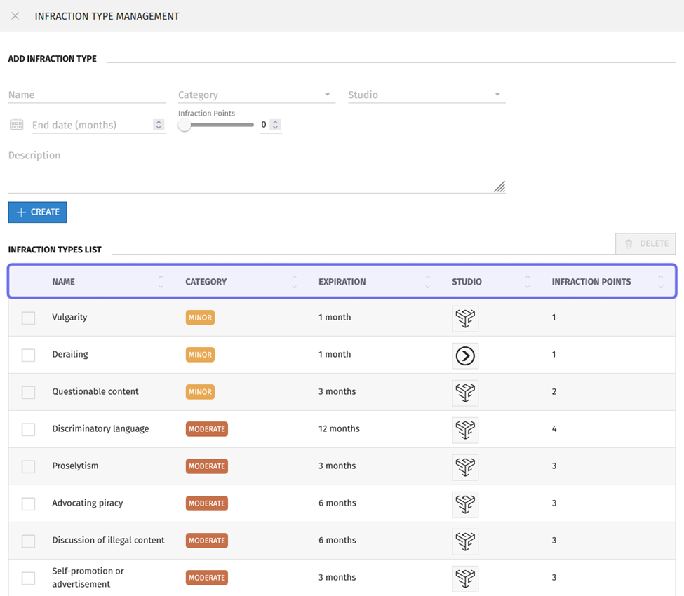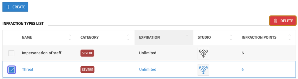 The “Infraction Type Management” side panel will open. Below the “+ Create” button is the “Infraction Types List.” The list shows all infraction types with a column displaying each infraction type’s name, category (severity), expiration (end date), studio, and infraction points.