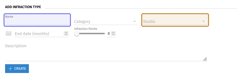 The “Add Infraction Type” section is shown above. The “Name” field is highlighted in purple. The “Studio” field is highlighted in yellow.