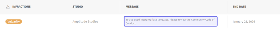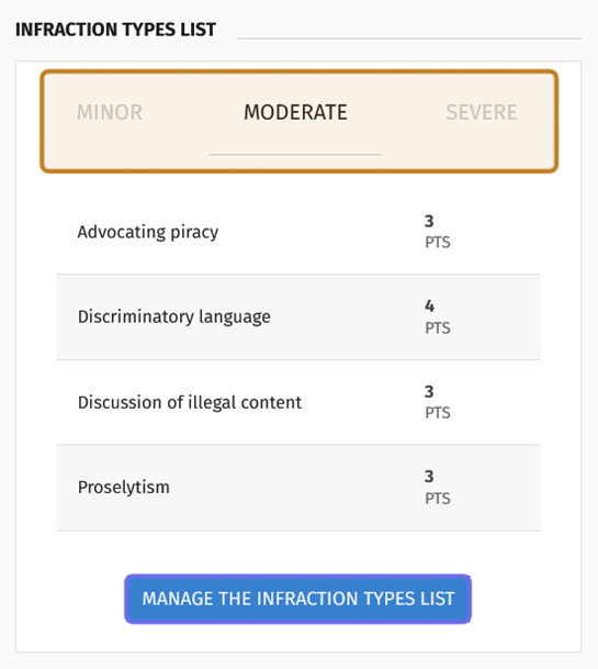 Infraction types are used by moderators on the front end. Sharing possible infractions in your community code of conduct helps to clarify expectations and possible consequences for conduct violations.