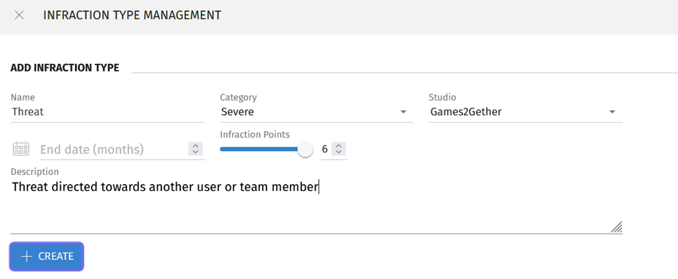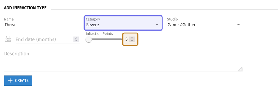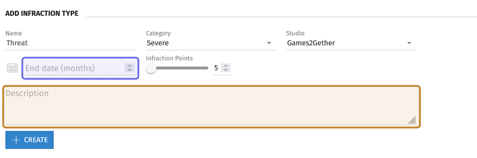 Then, add a short description of the infraction type in the text box labelled “Description.” The infraction description is visible to the user who committed the infraction.