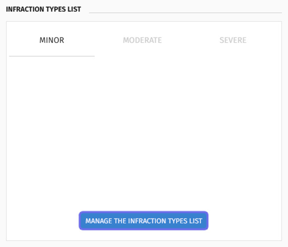 Click the “Manage the Infraction Types List” button at the bottom of the block. This will open the “Infraction Type Management” side panel.