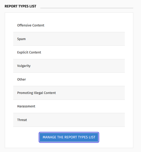 Navigate to the “Report Types List” block at the bottom of the “Moderation” page. Click “Manage the Report Types List” to open the “Report Type Management” side panel.