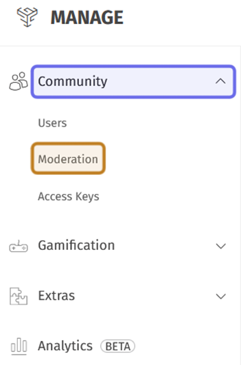 The “Community” dropdown in the “Manage” menu is highlighted in purple above. “Moderation” is highlighted in yellow in the submenu.